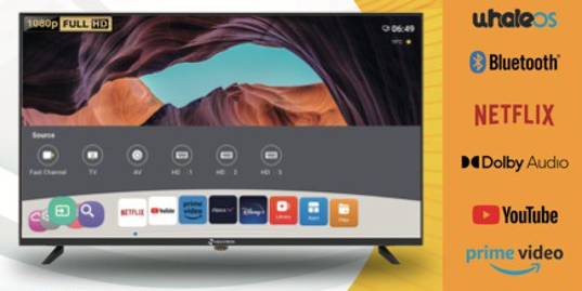 DESCRIPTION:55" INCHESWHALE OPERATING SYSTEMSMART BORDER LESS TVBLUETOOTHNETFLIXDOLBY AUDIOYOUTUBEPRIME VIDEO