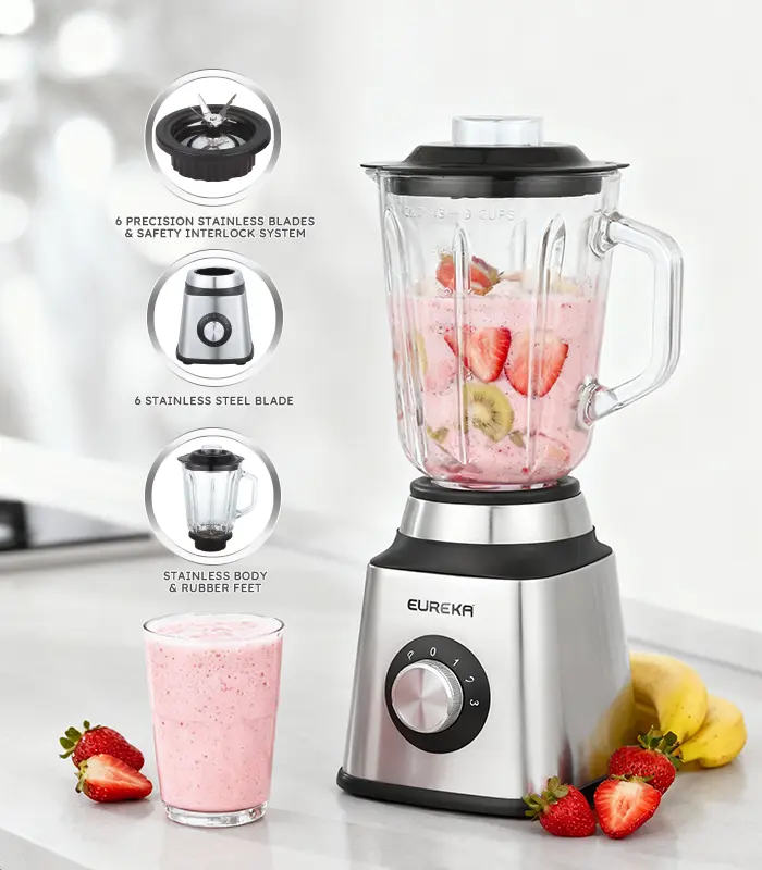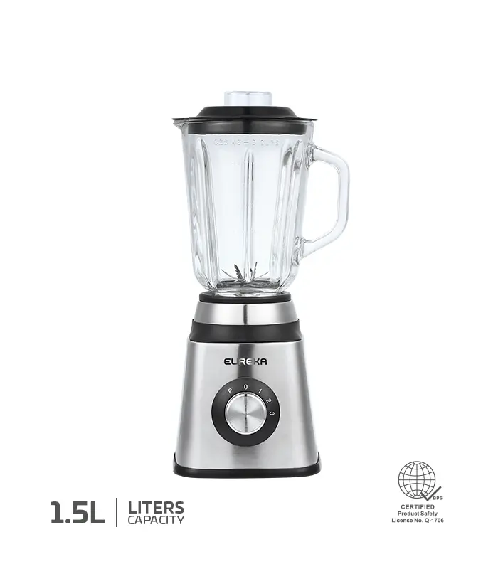 • 6 Precision Stainless Blades • Safety Interlock System • 3 Speed and Pulse Control • 500 Watts High Power Motor • Temperature Control • Full Copper Bearing • 1.5 Liters Big Glass Jar • Safety Design Lid • Voltage: 230V a.c. 60H z
